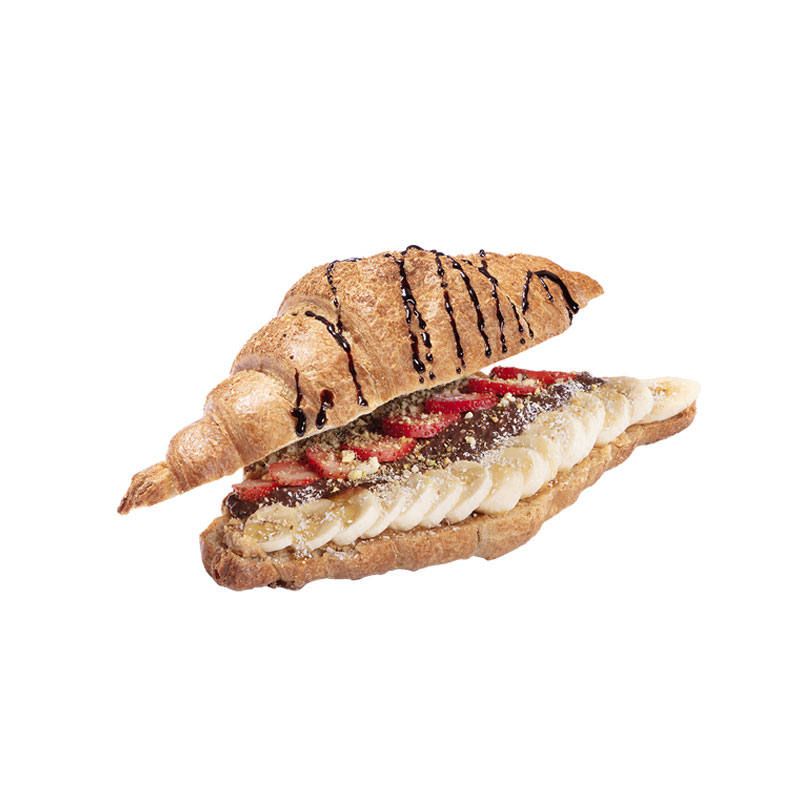 یک عدد، کروسان رژیمی، دانه چیا طعم دار شده با شکلات تلخ و استویا، اسلایس موز، اسلایس توت فرنگی، پودر نارگیل، شکلات تلخ