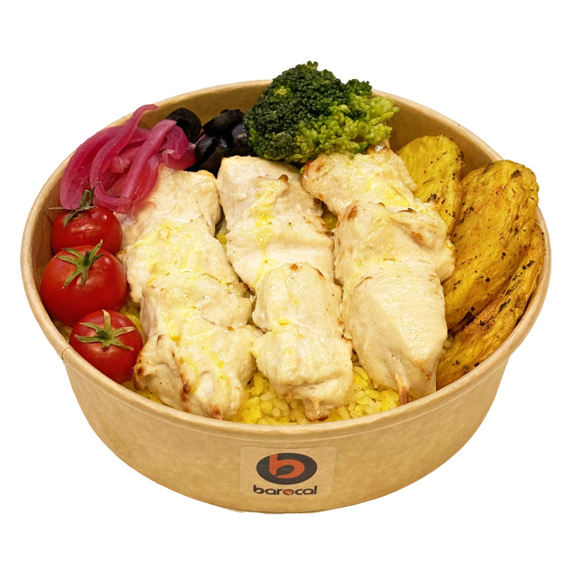 سه سیخ جوجه کباب سینه مرغ طعم دار شده ماستی 100 گرمی، 200 گرم برنج ایرانی زعفرانی، دورچین: پیگل پیاز، بروکلی بلانچ، زیتون سیاه، 50 گرم سیب زمینی تنوری