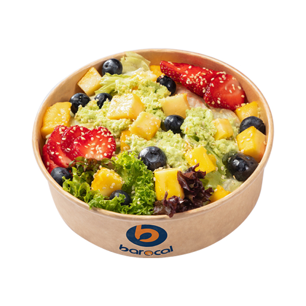 میکس کاهو، انبه اسلایس، گوجه گیلاسی، آووکادو، کنجد، توت فرنگی، بلوبری
