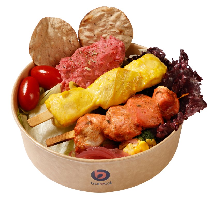 ۱۰۰ گرم میکس کاهو، یک سیخ جوجه زعفرانی ۸۰ گرمی، یک سیخ جوجه مکزیکی ۸۰ گرمی، ۵۰ گرم هموس لبو، گوجه گیلاسی، بروکلی، ذرت، نان چیپسی، سس ماست
