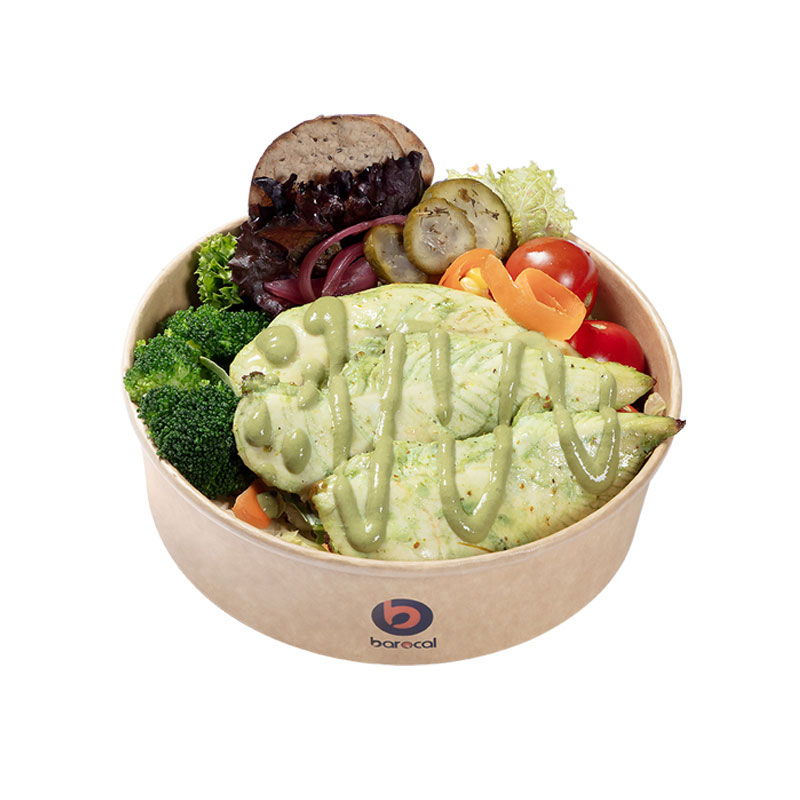 سه عدد فیله مرغ (۱۸۰ گرم) طعم دار شده با سس پستو، ۱۰۰ گرم کاهو میکس، ۸۰ گرم میکس سبزیجات، ۳۰ گرم بروکلی، گوجه گیلاسی، پیکل پیاز، سس پستو
